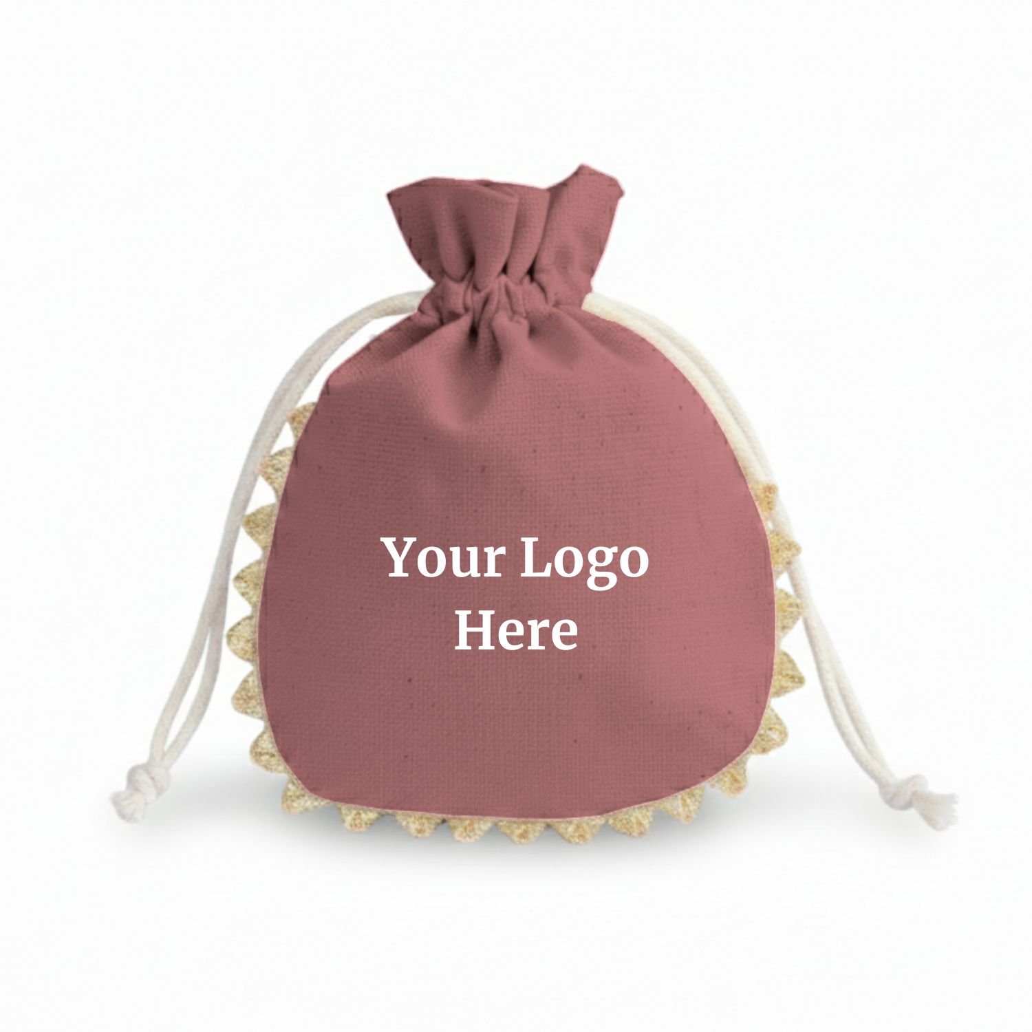 Rose Quartz Cotton Drawstring Pouches with Golden Lace & Custom Logo – 100 Pcs
